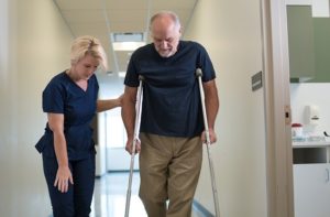 Использование ходунков или костылей. Как минимум, в течение 6-ти недель больному предстоит при ходьбе использовать ходунки или локтевые костыли, при этом с первых дней пациенту необходимо проявлять двигательную активность. При проведении одномоментного эндопротезирования двух коленных суставов срок применения костылей может увеличиваться до 3 месяцев. Большой вес пациента и развитие ряда осложнений также может быть показанием к продлению периода использования дополнительной опоры. При необходимости в переходном периоде после отказа от костылей пациент может использовать специальную трость.